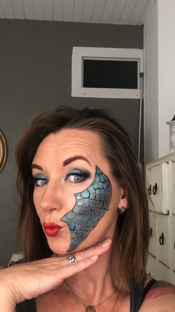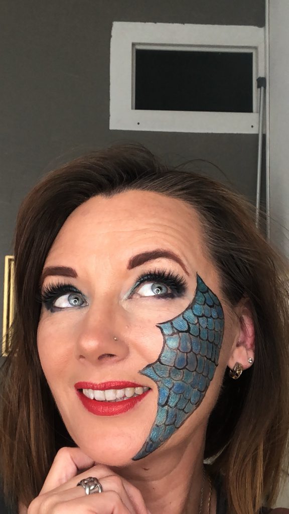 Pour ce maquillage que ce soit pour les yeux comme sur la joue je n’ai utilisé que des fards à paupières secs ou humidifiés avec mon tonic. Les faux cils utilisés sont très simples à mettre en place car c’est un liner magnétique appliqué directement en ras de cils qui va permettre aux cils de tenir.